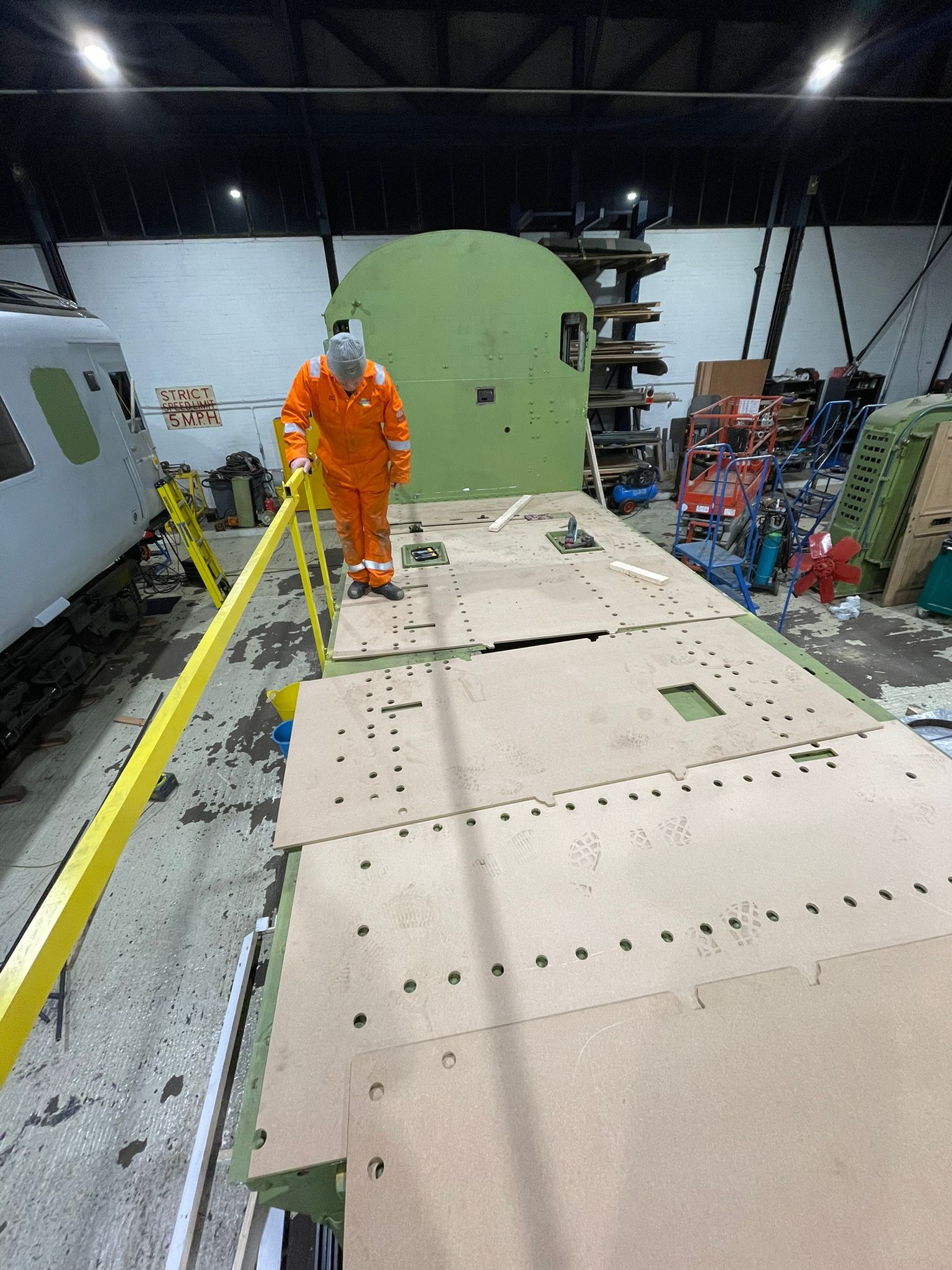 Some of the obsolete parts, such as the diesel engine, were stripped from the locomotive prior to transporting it out of Wolsingham. For moving it to Positive Traction HQ in Chesterfield, the number was covered as the project needed to be kept under wraps until significant progress had been made. The covering up of the number did not go unnoticed on social media!